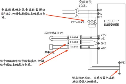 變頻器遭受的雷電危害主要來(lái)自于線路感應(yīng)的浪涌危害,包括信號(hào)感應(yīng)和電源進(jìn)線感應(yīng)。解決方案見(jiàn)下圖:
